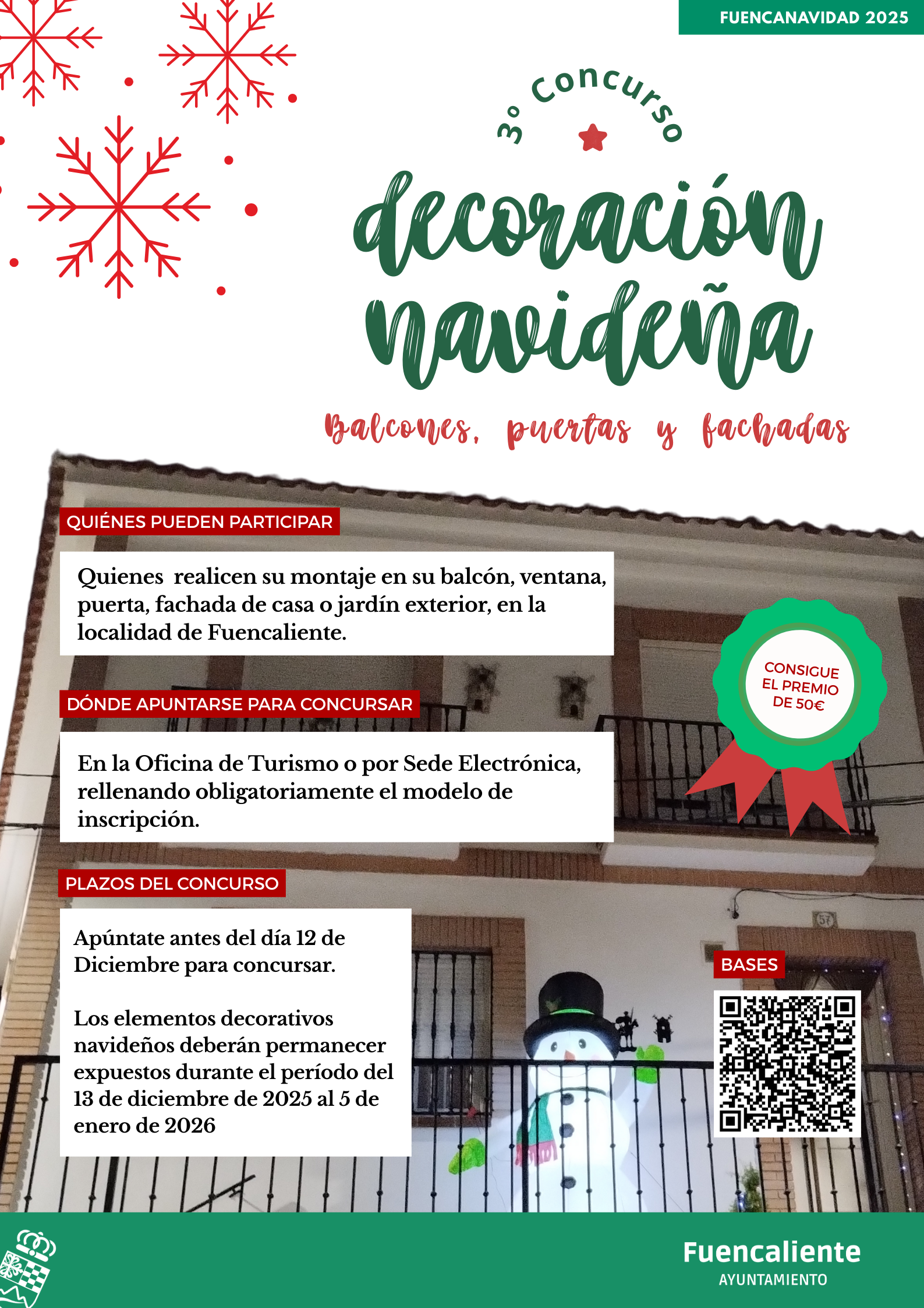 Por tercer año, el Ayuntamiento de Fuencaliente, presenta el Concurso de Decoración Navideña de balcones, fachadas y puertas, “FUENCANAVIDAD” dirigido a vecinas y vecinos del municipio de Fuencaliente.